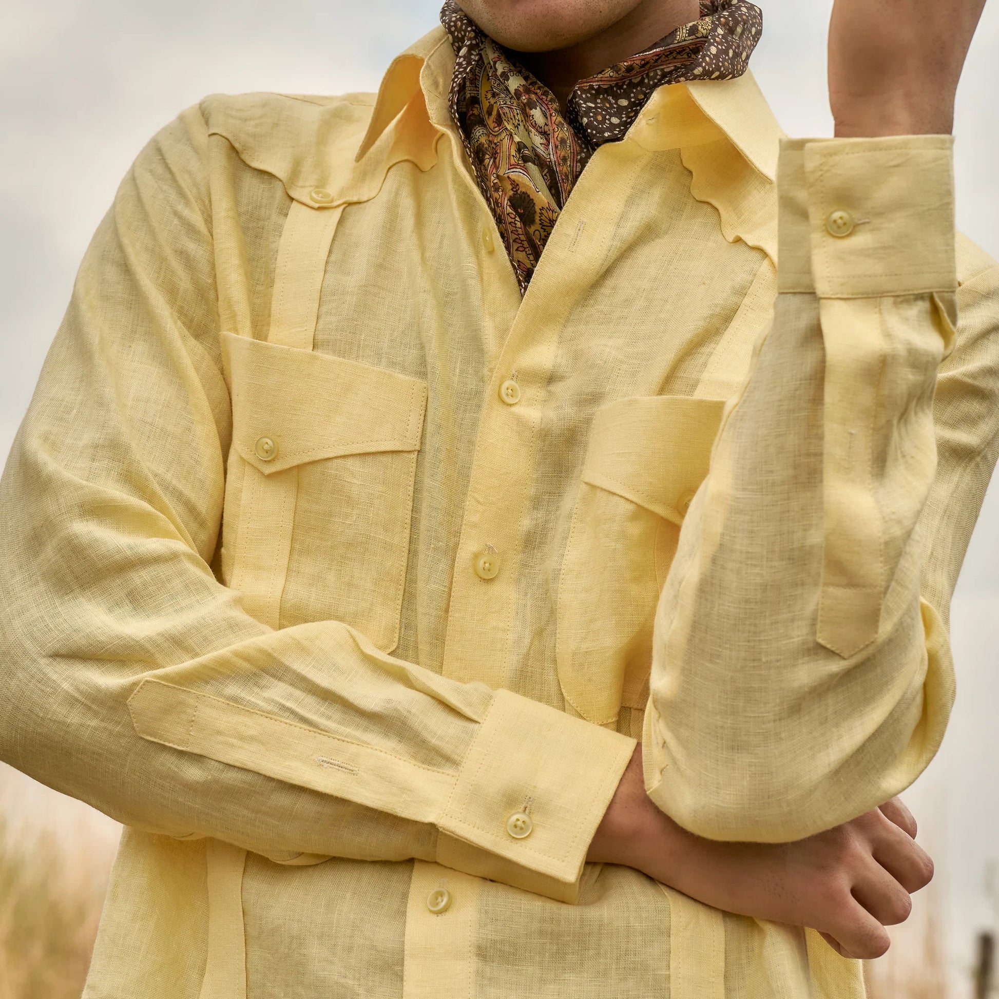 Designed for long, golden hours and quiet escapes, the Summer Yellow Hunter Shirt brings together traditional tailoring with effortless summer comfort. Crafted from 100% cotton linen, the weave is airy and open, letting the fabric breathe and move with ease.